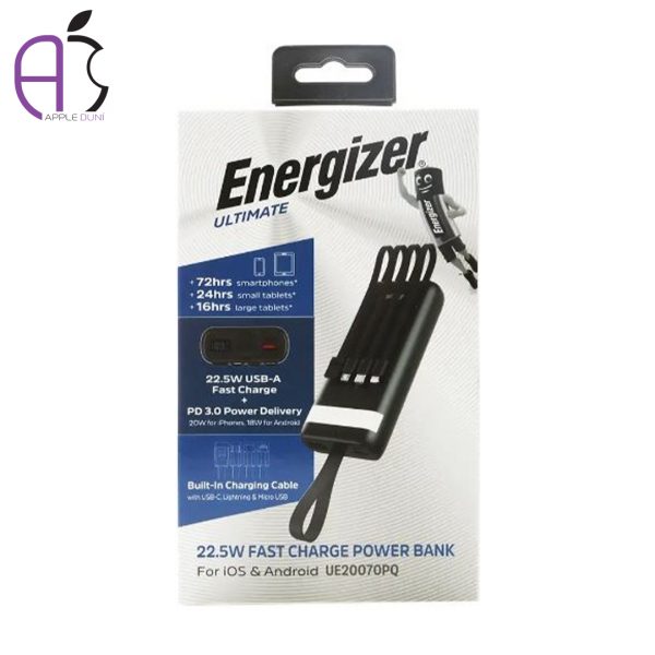 (Power Bank) مدل UE20070PQ از سری پاوربانکهای 20000 میلیآمپر شرکت انرجایزر و با بکار گیری فناوری فست شارژ به منظور شارژ رسانی سریع به تلفنهای هوشمند با سیستم عامل اندورید و iOS و تبلتها تولید شده است.