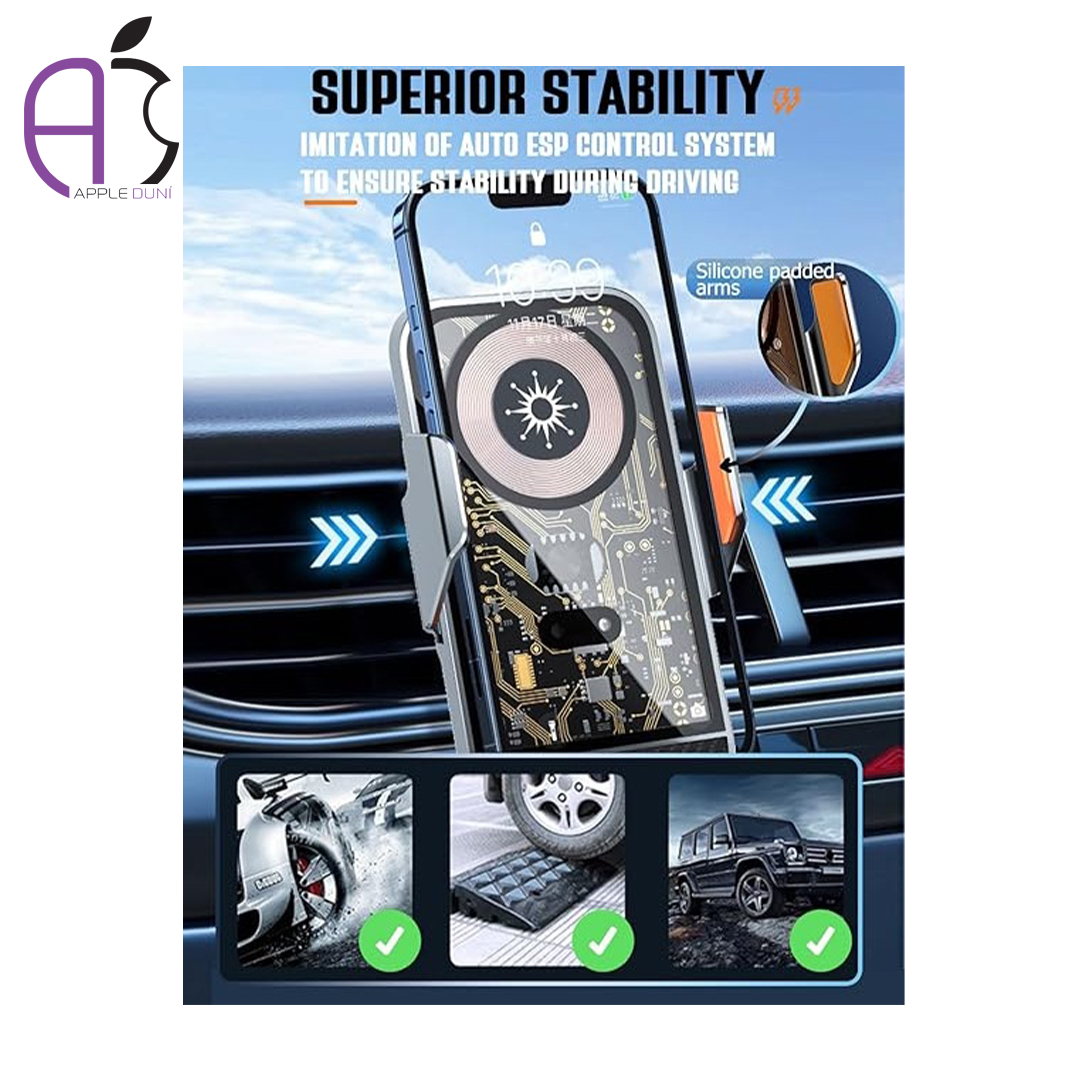 هولدر فست شارژ وایرلس با گیره اتوماتیک مدل C10 دارای محفاظت همه جانبه و پایداری بسیار بالایی می باشد، به طوری که بازوی مکانیکی هولدر از سیلیکون ضد لغزش نرم و ضخیم ساخته شده است که اصطکاک را کاهش می دهد و در عین حال نقش ضربه گیر و ضد لغزش را ایفا می کند و از موبایل شما کاملا محافظت می کند.